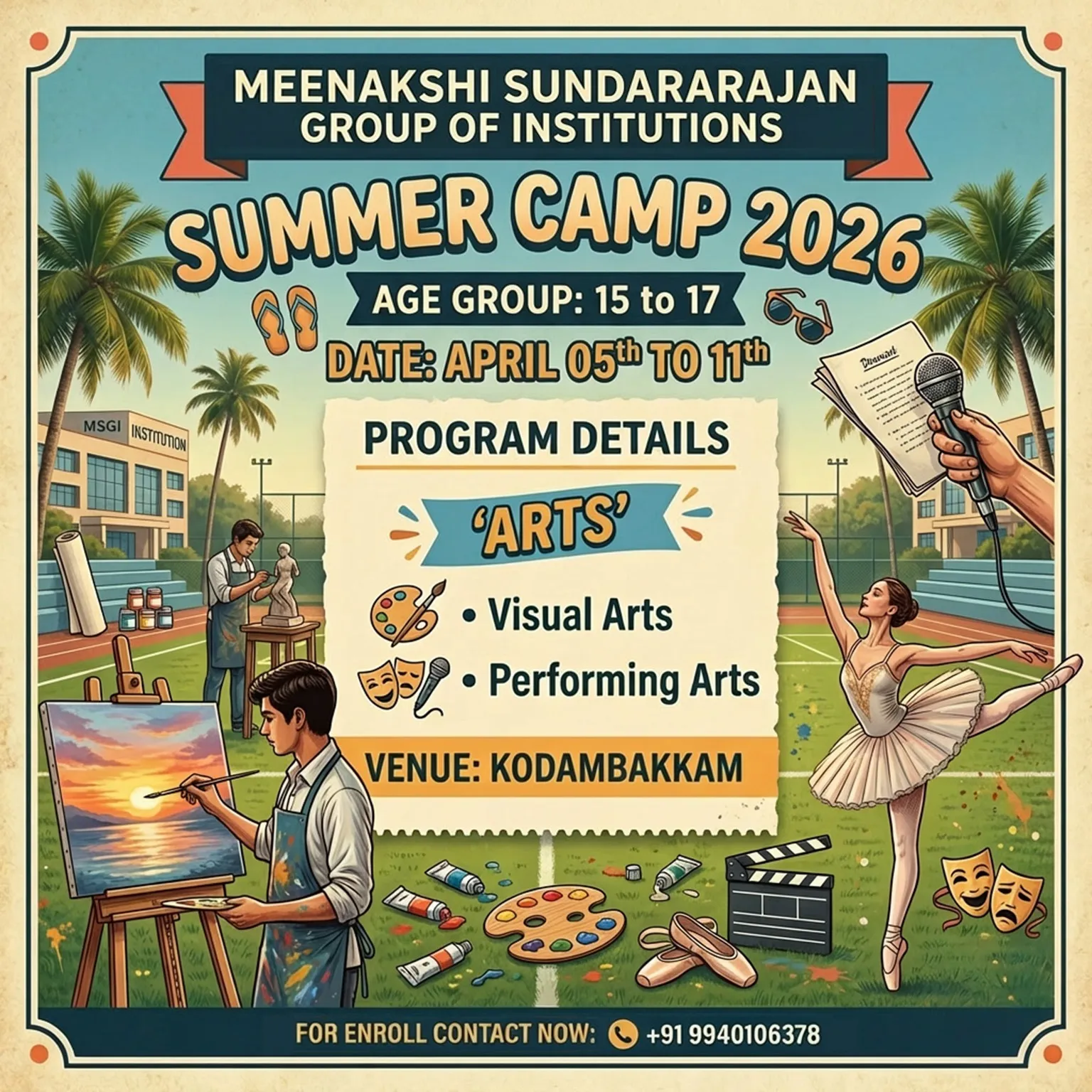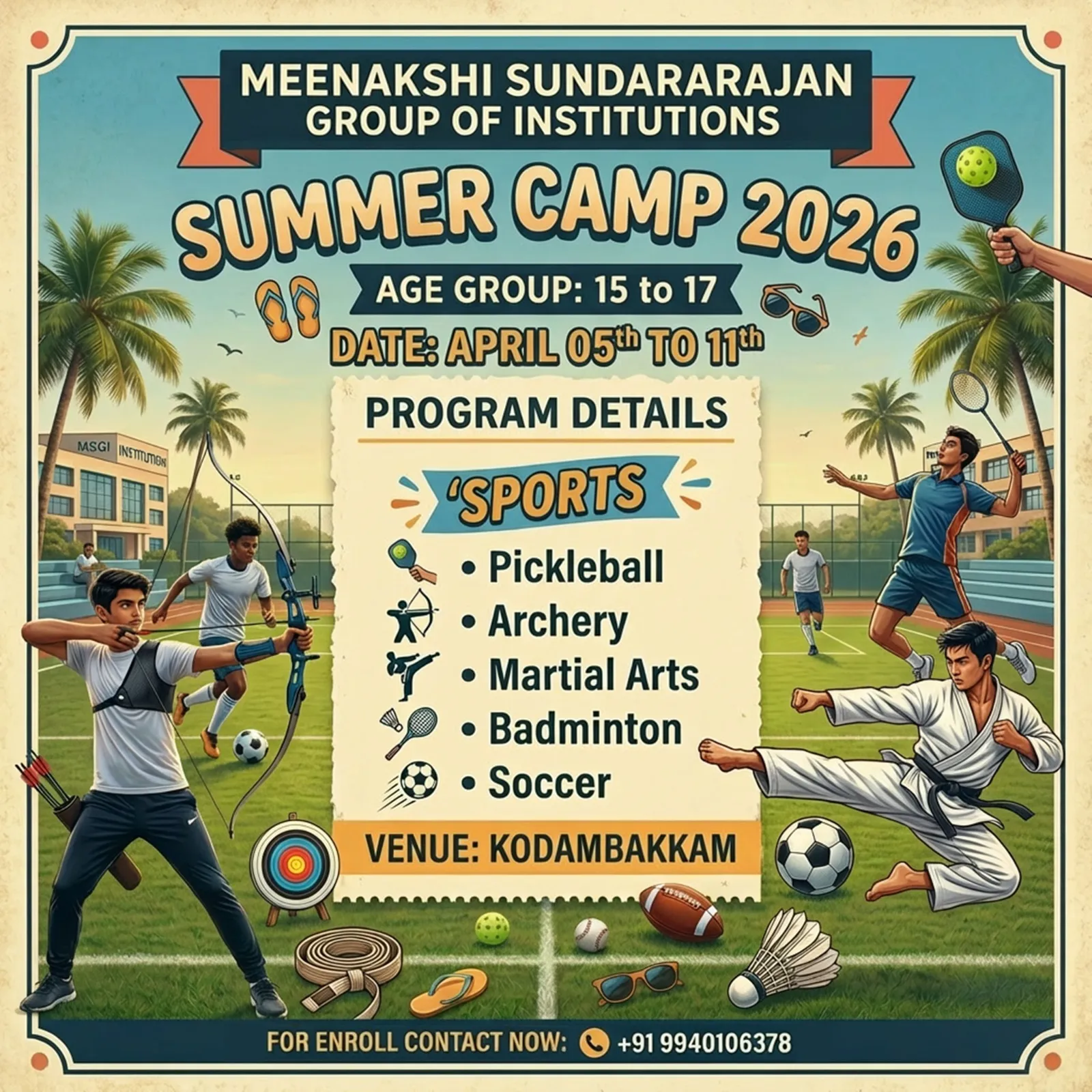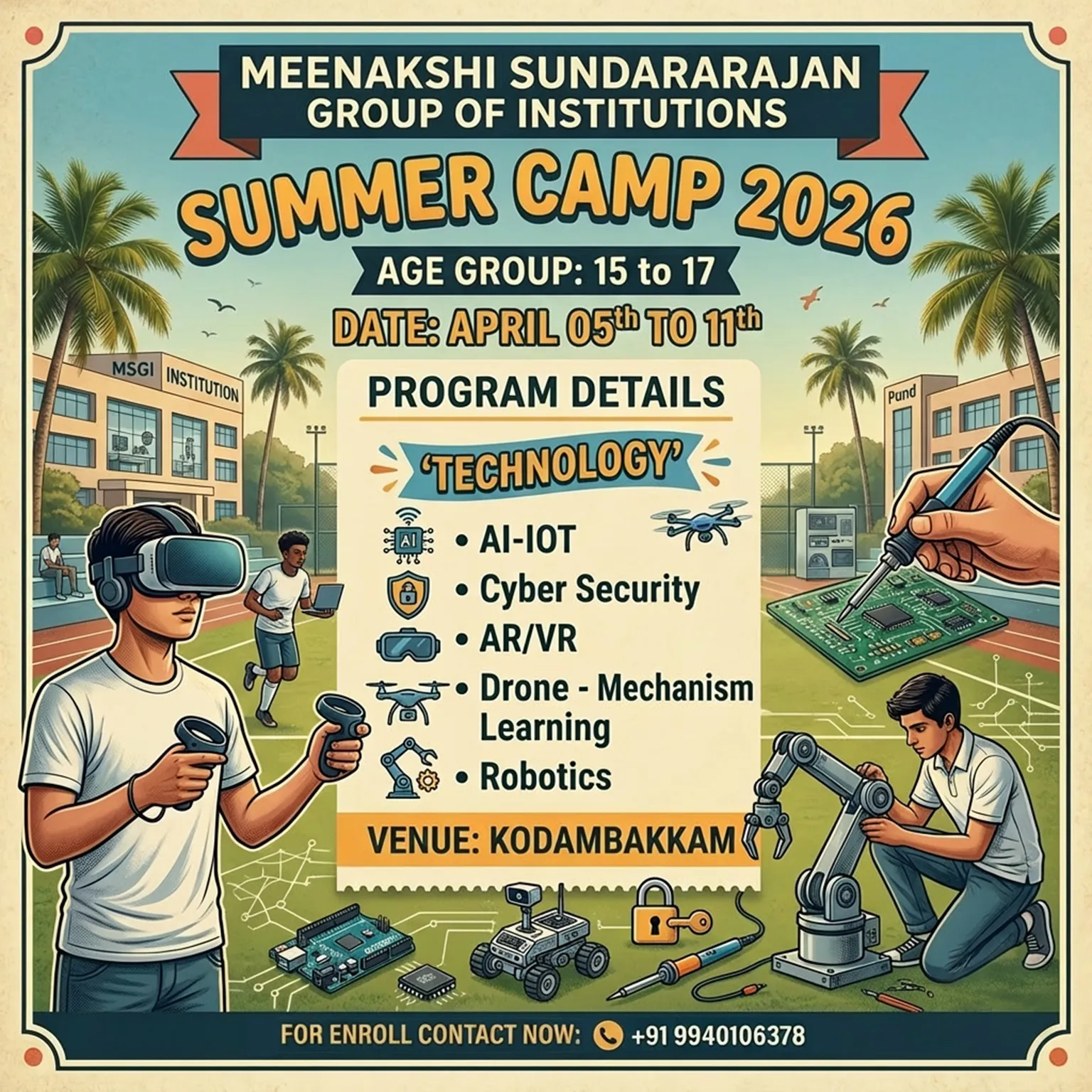 Hosted by the prestigious Meenakshi Sundararajan Group of Institutions (MSGI) in the heart of Kodambakkam, our camp offers a perfect blend of modern technology and traditional values. We focus on holistic development through: