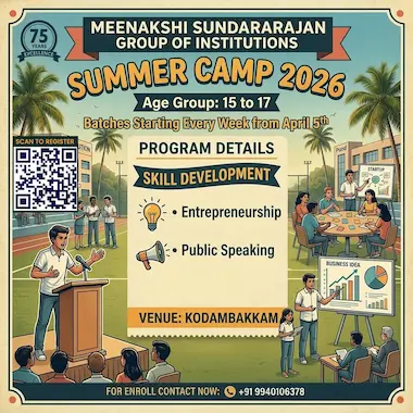 Hosted by the prestigious Meenakshi Sundararajan Group of Institutions (MSGI) in the heart of Kodambakkam, our camp offers a perfect blend of modern technology and traditional values. We focus on holistic development through: